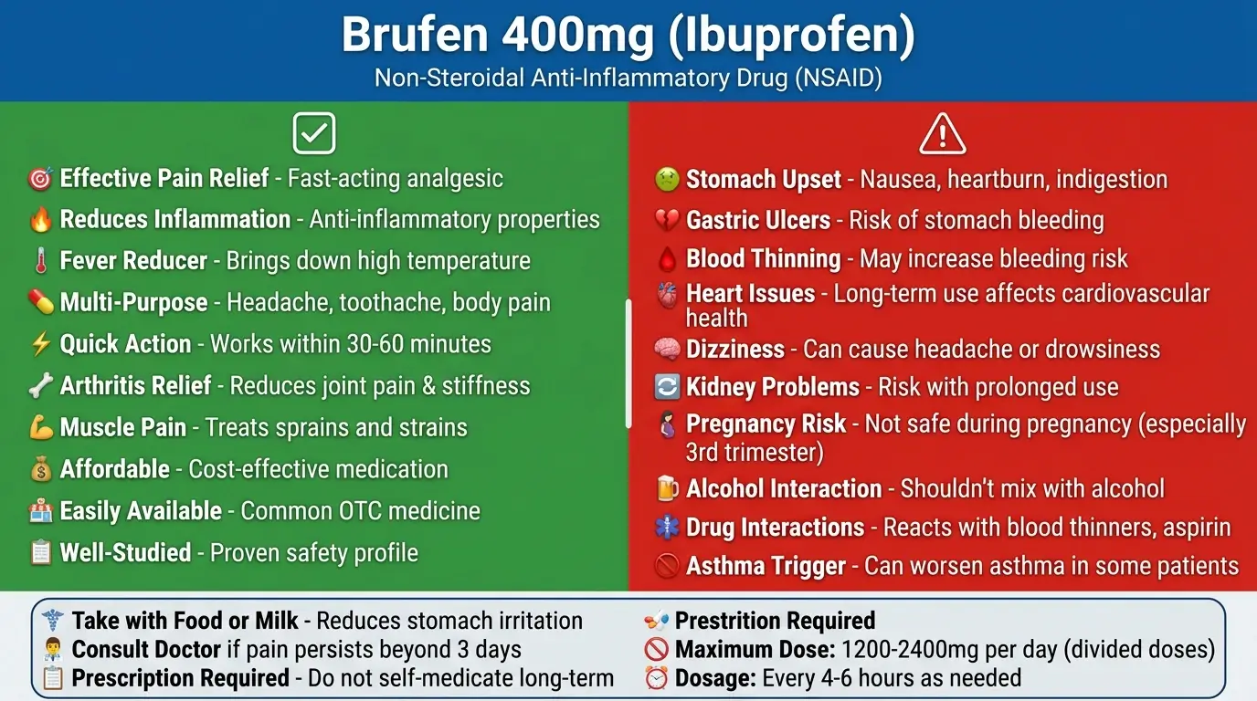 Ibuprofen is great at reducing pain and swelling in many parts of the body at once because it blocks both COX-1 and COX-2 enzymes from operating. It also works on the part of the brain that controls body temperature, which is why it is so good in lowering fever. After taking a Brufen 400 mg tablet, most people feel better within 30 to 60 minutes. For around four to six hours, the pain goes away.