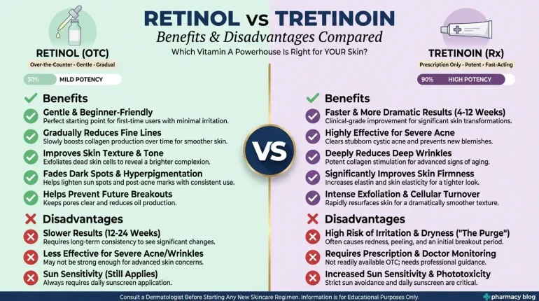 Bottom line: Tretinoin = prescription only, stronger, faster results, not for the faint-hearted.