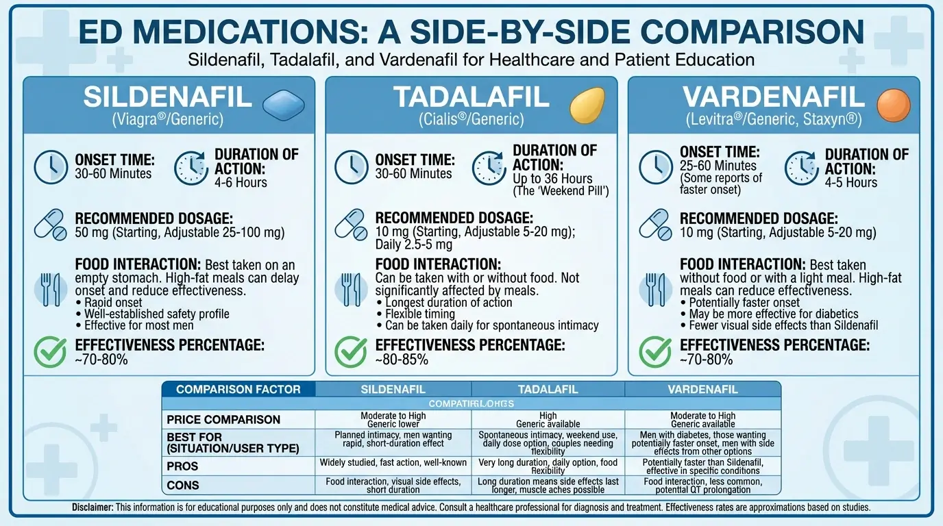 | Feature | Sildenafil | Tadalafil | Vardenafil |